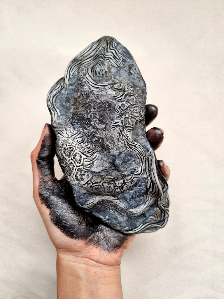 An indecipherable ceramic moon from the lost past, dipped in ink and rolled onto canvas